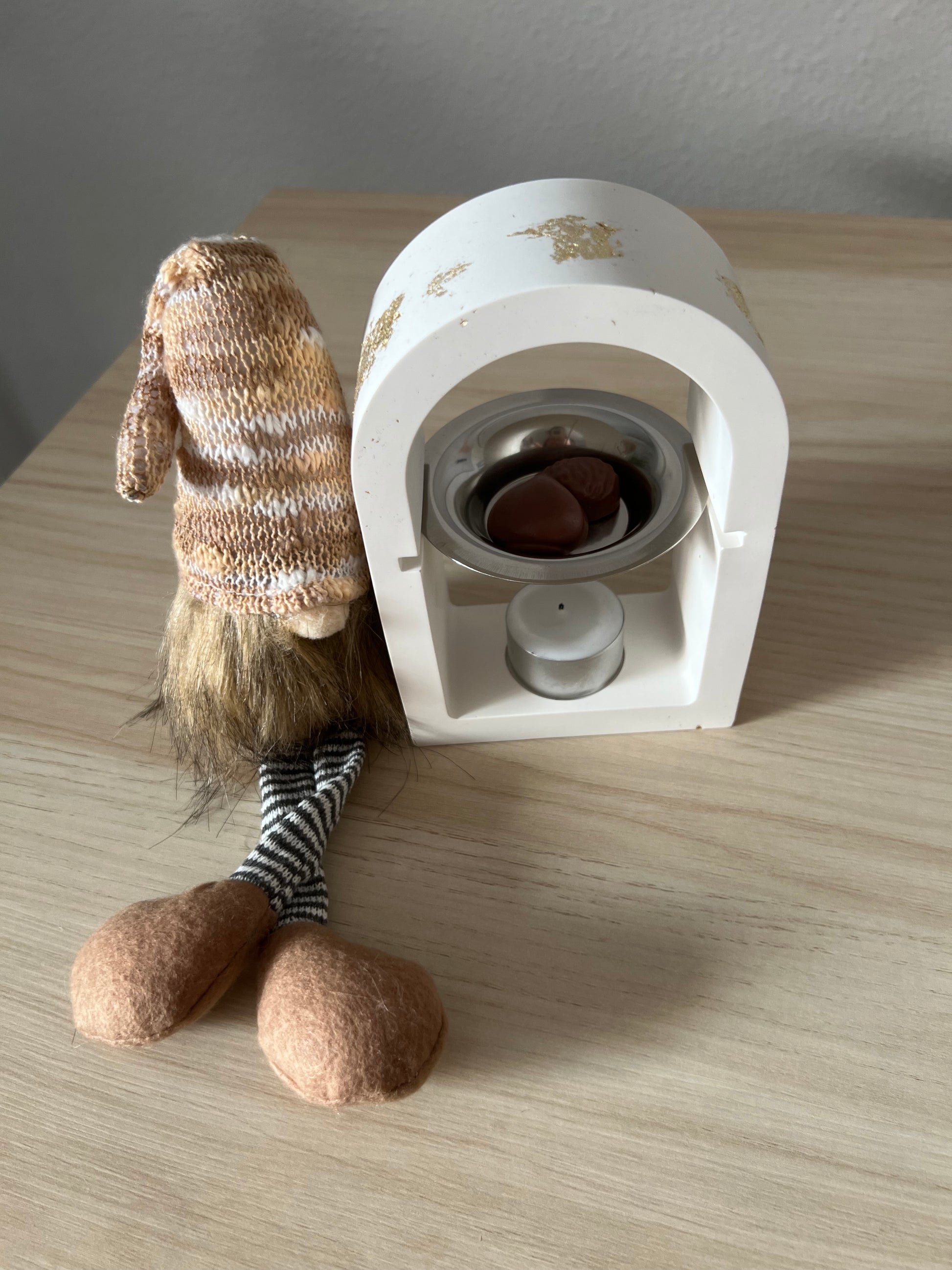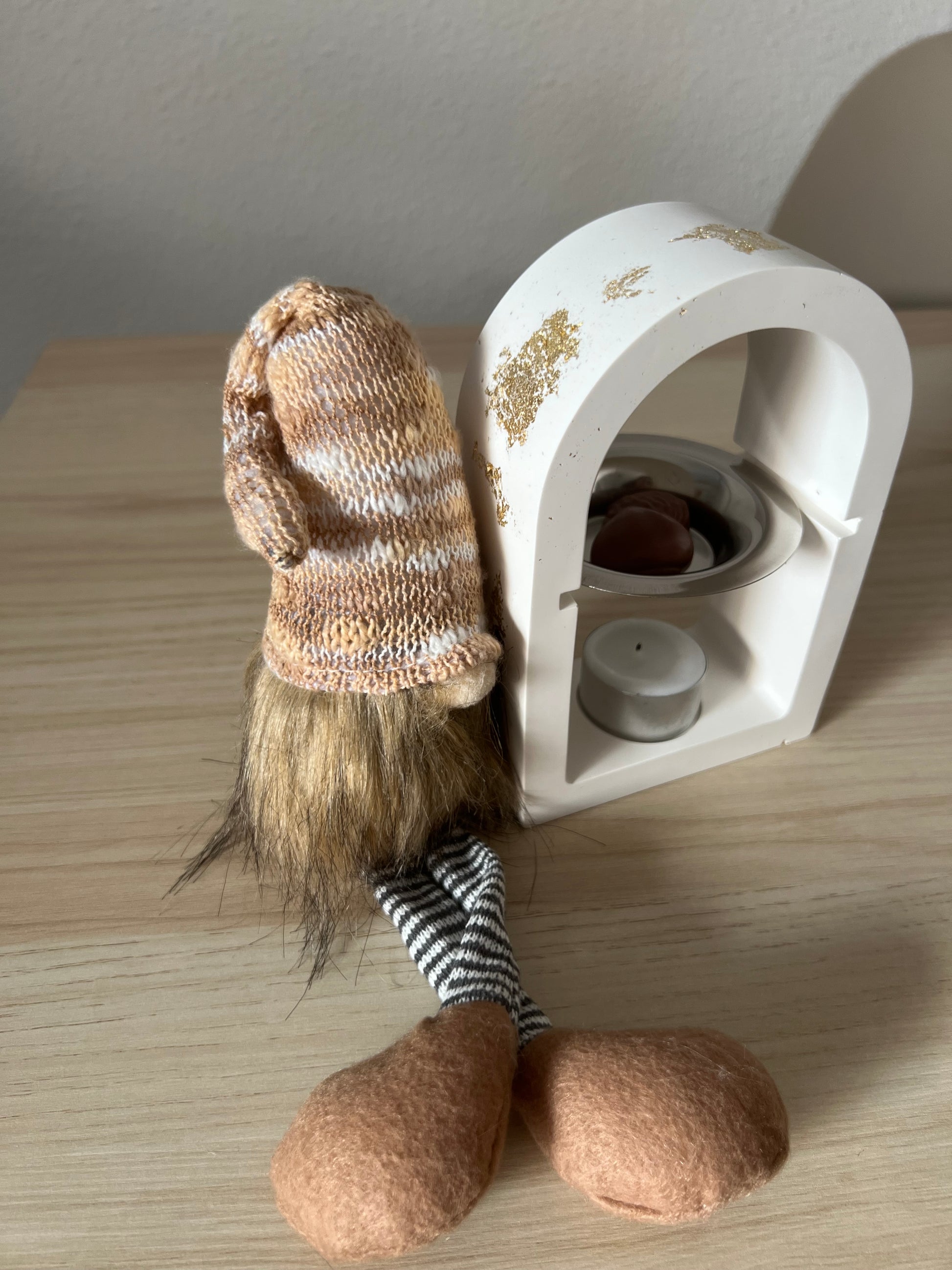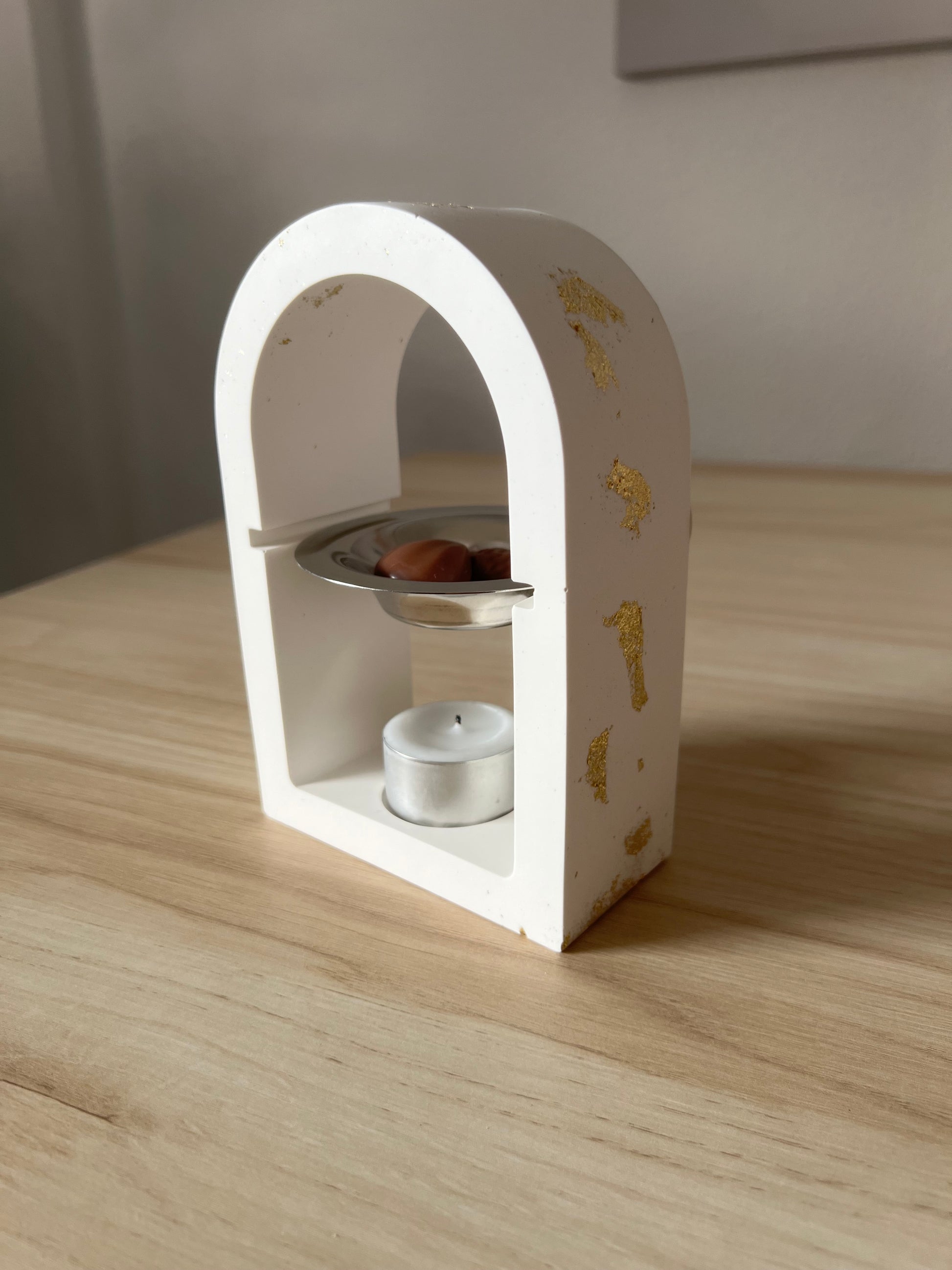 Este encantador quemador de ceras aromáticas combina elegancia y calidez en una pieza artesanal hecha con resina ecológica, cuidadosamente elaborada a mano 🤍. Su diseño en forma de arco aporta un toque moderno y acogedor a cualquier rincón de tu hogar, mientras que los delicados detalles dorados evocan la magia y el brillo de la Navidad ✨
