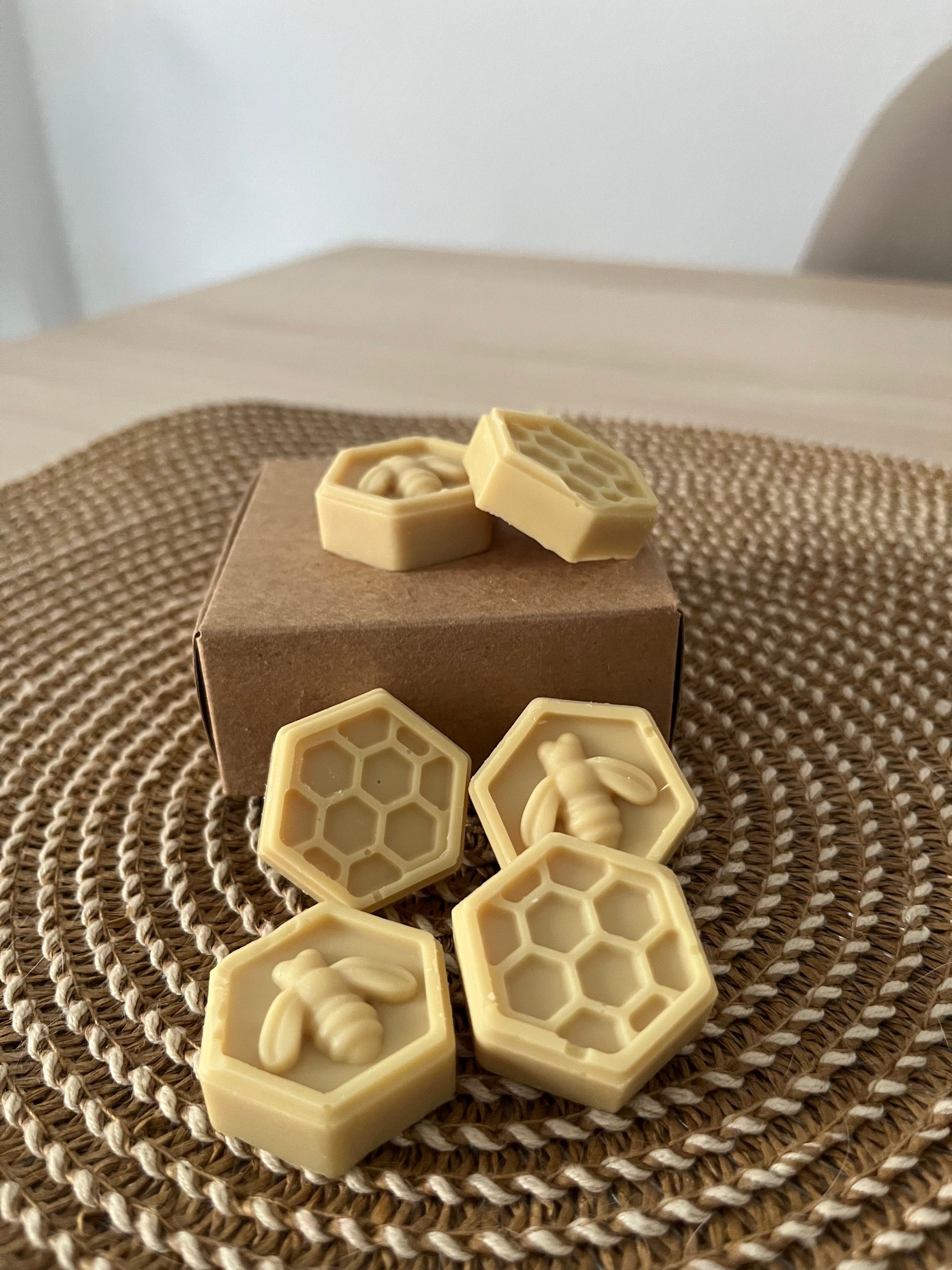 🍯🐝 Estas ceras aromáticas son un verdadero homenaje a la dulzura de la naturaleza 🌸✨. Con forma de panal y abejita, están elaboradas artesanalmente con cera de soja 🌿 y desprenden un aroma cálido y envolvente de almendro en flor y miel 💛.